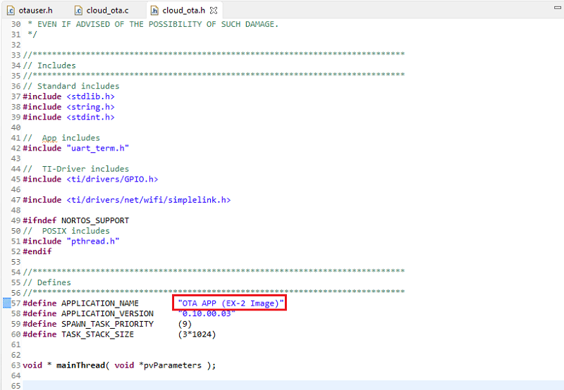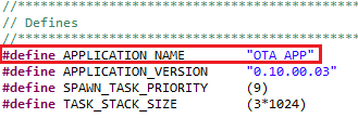 cloud_ota.h, update theAPPLICATION_NAMEdefinition to"OTA APP (EX-2 Image)"as shown below and rebuild the project. We will only change the application name (the name will help us differentiate between the current app and the updated one).
