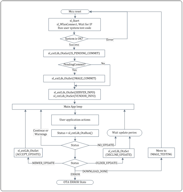 OTA_init(): Initializes the OTA library. The host application should define a global buffer for the use of the OTA library and provide this buffer while it initiates the OTA.OTA_set(): Sets an OTA library parameter. Used to set CDN Server information and to update the status of the loaded image (DECLINE,ACCEPT,COMMITorROLLBACK).OTA_get(): Retrieves OTA library parameters, e.g.IS_ACTIVEorVERSIONSinfo (current image version and new update version).OTA_run(): Trigger the OTA library state machine. This will trigger OTA polling, download, etc. It should be called repeatedly until it gets theDOWNLOAD_DONEreturn code.