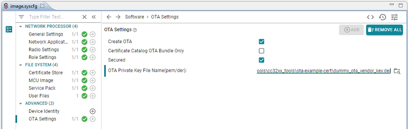 image.syscfgand go to OTA Settings. Check Create OTA and Secured.You will need to select a OTA Private Key File Name. This private key will be used to sign the image. For this exercise, use the demo-only private key available in the SDK: