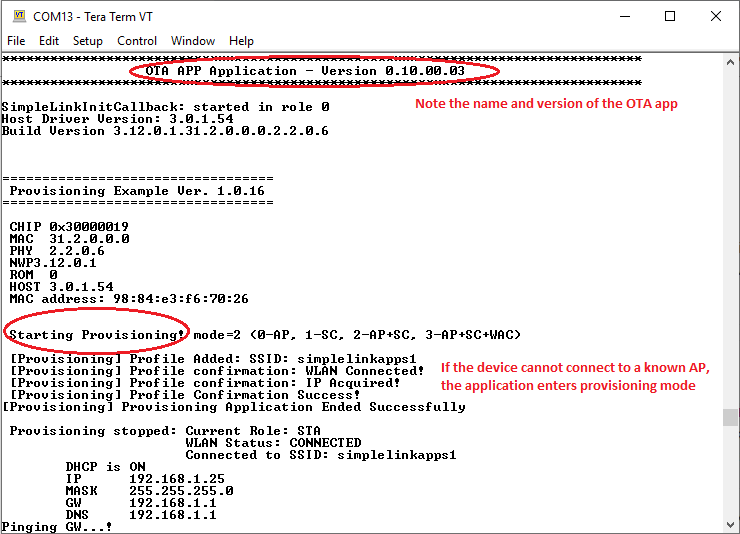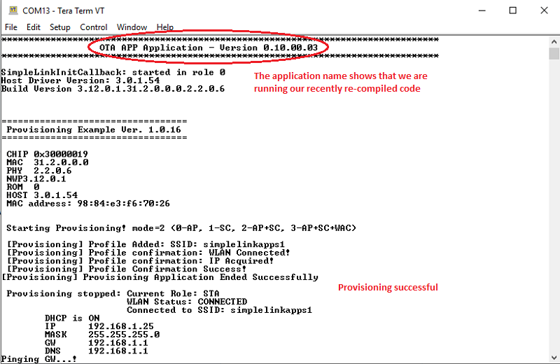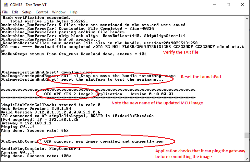 Note that after a successful OTA sequence the new image should be triggered. You can verify this by looking at the application name.