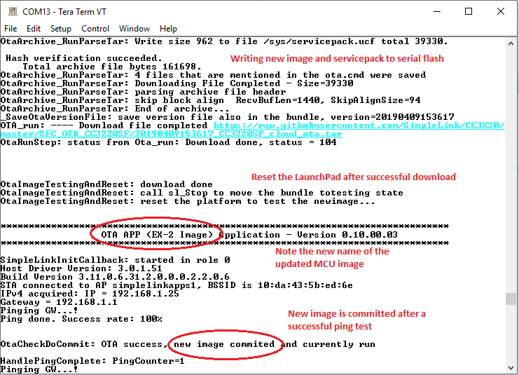 You should see OTA messages handling the CDN server connection, downloading content, parsing and installing it. The log below shows the flash programming messages, the platform reset, and the activation of the newly programmed image. The application commits the temporary image after a successful sanity check (pinging the gateway).