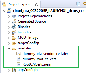 dummy_ota_vendor_cert.der) to theuserFilesfolder. This is available insimplelink_cc32xx_sdk_x_xx_xx_xx/tools/cc32xx_tools/ota-example-cert/. This certificate will be used to authenticate the pre-built secure OTA image for this exercise.We will learn more about this key pair and signing the OTA image in the next section of this lab.