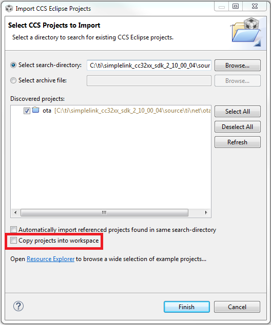 otalibrary project found insimplelink_cc32xx_sdk_x_xx_xx_xx/source/ti/net/ota/ccs. This is the supporting OTA library that works for all device types and RTOS. Be sure you UNCHECK the box Copy projects into workspace.