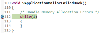 Build and load the project. Before you run, set a hardware breakpoint in the vApplicationMallocFailedHook()