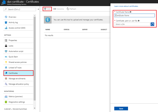 Add the root CA certificate (that we used to sign the device ID certificate) to the DPS instance. From the Settings pane on the left, go to Certificates and Add our