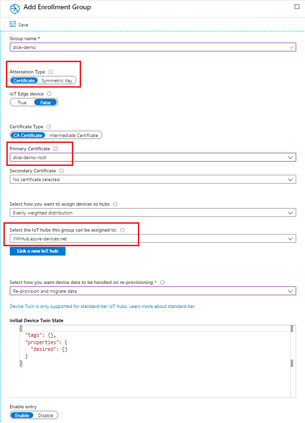 openssl x509 -req -in verification.csr -CA rootca.pem -CAkey rootca-private-key.pem -CAcreateserial -out verification.pem -sha256Our last step is to add the enrollment group. From the Settings pane, go to Manage enrollments and Add enrollment group. We will configure the group for X.509 based devices by selecting the Certificate attestation type and choosing our root CA as the Primary Certificate.