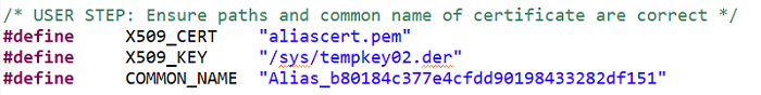 prov_dev_client_ll_sample.hand find the definitions forX509_CERT,X509_KEY, andCOMMON_NAME.We will be using the alias certificate chain and alias key generated by the DICE software and stored in the device serial flash. Define