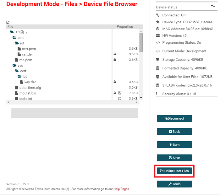 After programming, Connect the LaunchPad again, and go back to Tools from the Advanced view. Now we will write the signed device ID certificate to the serial flash.