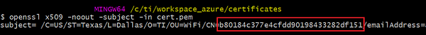 X509_CERTas"aliascert.pem"andX509_KEYas"/sys/tempkey02.der".The common name of the alias certificate contains the unique device ID (UDID) of the CC323x. One way to retrieve this is to find the common name of our device ID certificate using OpenSSL.