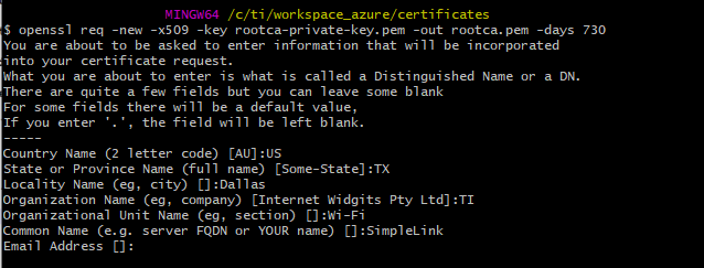 To sign the device ID certificate, we first need a root CA. For this lab, we will use OpenSSL to create a self-signed root CA. You can also use a root CA certificate and key provided by a certificate authority.