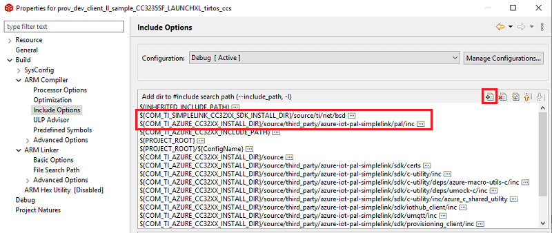 tlsio_sl.c, we need to add two additional include paths. Go to Project Properties -> Build -> ARM Compiler -> Include Options. Add the following include paths:${COM_TI_SIMPLELINK_CC32XX_SDK_INSTALL_DIR}/source/ti/net/bsd${COM_TI_AZURE_CC32XX_INSTALL_DIR}/source/third_party/azure-iot-pal-simplelink/pal/inc