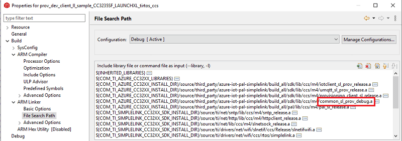 tlsio_sl.c, we also need to link to a library that includes the symbols for the other logging features. Go to Project Properties -> Build -> ARM Linker -> File Search Path. Double-clickcommon_sl_prov_release.aand change it tocommon_sl_prov_debug.a. Apply and close.