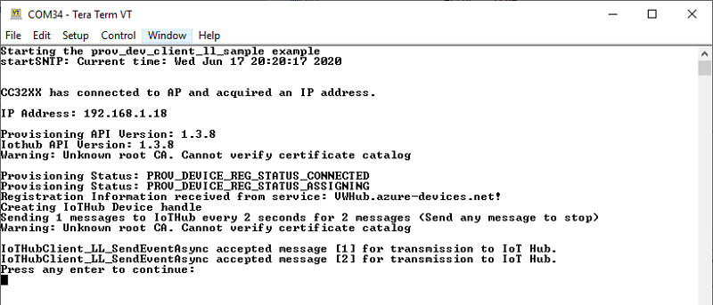 prov_dev_client_ll_sampleexample from the CC32xx Azure IoT Plugin.Open