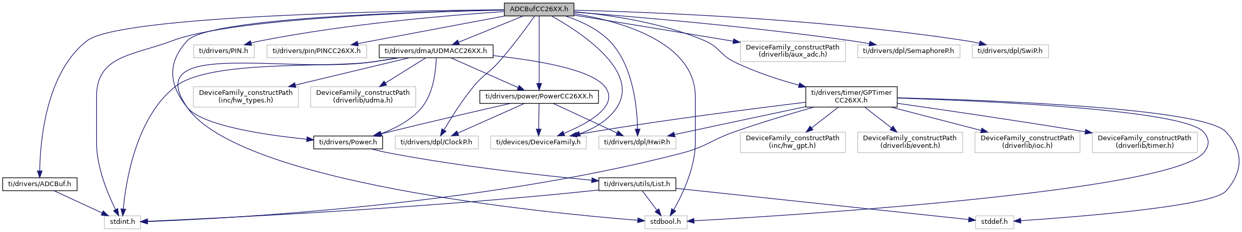 #include <stdint.h>#include <stdbool.h>#include <ti/drivers/ADCBuf.h>#include <ti/drivers/PIN.h>#include <ti/drivers/pin/PINCC26XX.h>#include <ti/drivers/dma/UDMACC26XX.h>#include <ti/drivers/timer/GPTimerCC26XX.h>#include <ti/drivers/Power.h>#include <ti/drivers/power/PowerCC26XX.h>#include <ti/devices/DeviceFamily.h>#include <DeviceFamily_constructPath(driverlib/aux_adc.h)>#include <ti/drivers/dpl/HwiP.h>#include <ti/drivers/dpl/ClockP.h>#include <ti/drivers/dpl/SemaphoreP.h>#include <ti/drivers/dpl/SwiP.h>