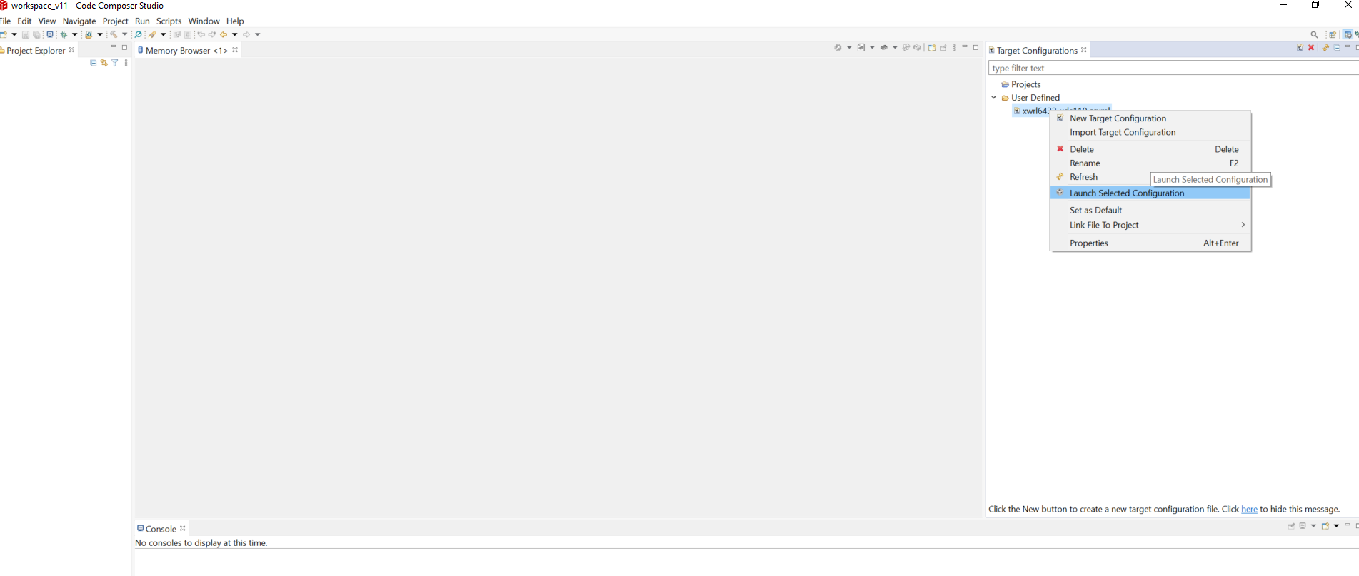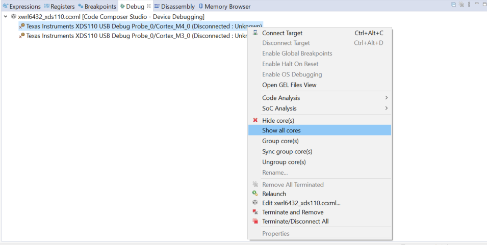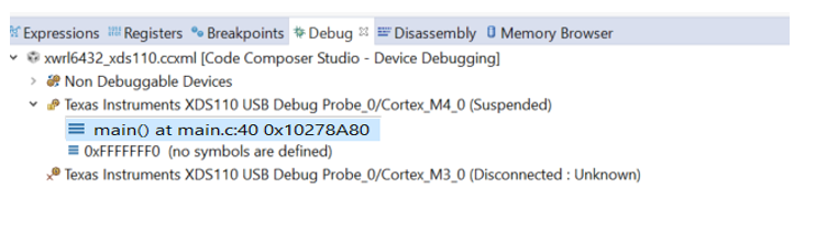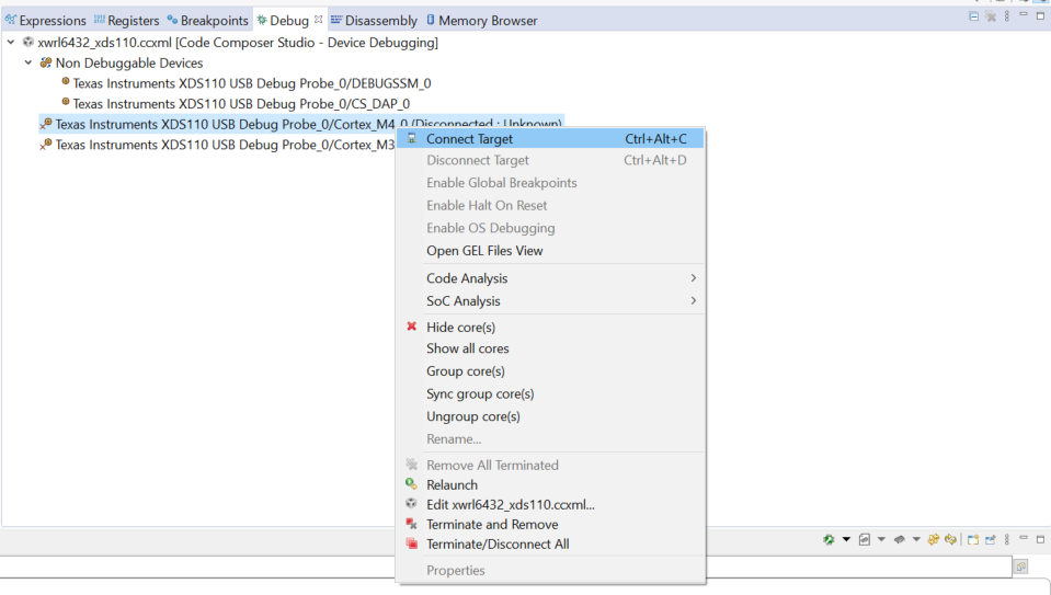 - You will see the xWRL1432 target configuration in the "Debug" window as shown below