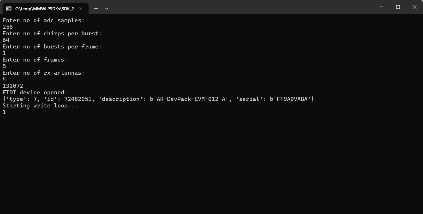 MMWAVE-L-SDK OOB (out-of-box) demo supports raw ADC data streaming through the LVDS interface. When the radar EVM board connected with the DCA1000EVM board, users can use the DCA1000EVM CLI application to capture the raw data without starting the mmWaveStudio GUI interface. The DCA1000EVM CLI application is primarily a command line tool for configuration of FPGA and recording based on the user inputs. The DCA1000EVM CLI application connects to DCA1000EVM system through 1GB Ethernet for configuration and recording of data. RADAR EVM is connected to DCA1000EVM for data capture and connected to PC for configuration of data generation. However, there are some important limitations associated with this feature:
