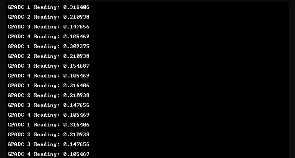 The OOB demo enables external voltage measurements through GPADC. It includes four GPADC channels, each supporting a distinct external voltage measurement. The GPADC operates with unbuffered voltage, has an input range of 0–1.8V, and a resolution of 0.007V. Example GPADC prints from UARTB are shown in the figure below. For more details on enabling GPADC channels, refer Sensor front-end parameters (gpAdcMeasConfig cli command).
