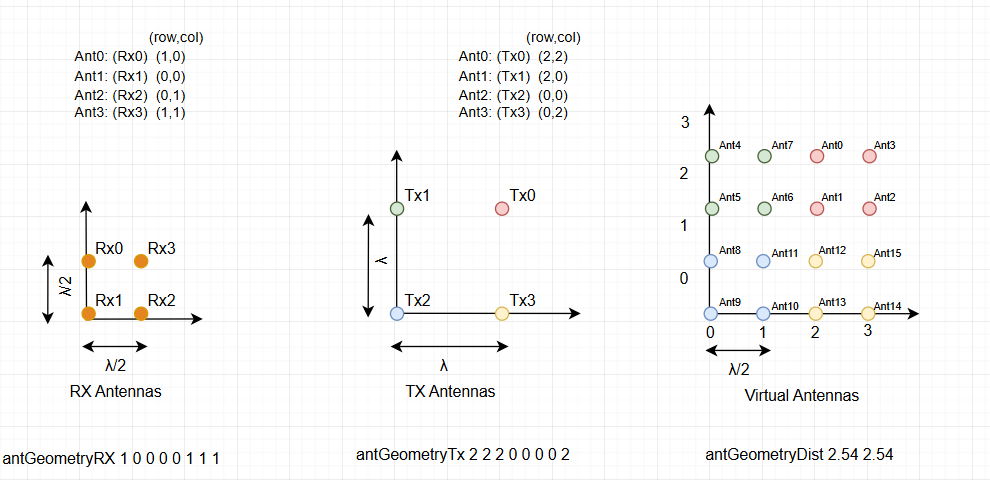The antenna spacing, antenna indices and the virtual antenna array are shown in Figure below. The right-most figure shows the virtual antennas. For calculating the TX/RX indices(row,col) for antGeometryTx/antGeometryRx, left bottom antenna is considered at origin and lamda/2 is considered for 1 unit in co-ordinate system.