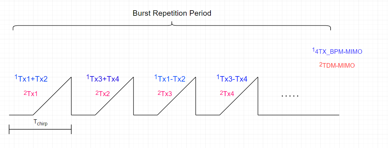 To achieve full MIMO capabilities, the xWRL6844 demo uses one of three demodulation techniques: 2TX_BPM-MIMO, 4TX_BPM-MIMO, and TDM-MIMO. Following sections briefly summarize the modulation schemes.