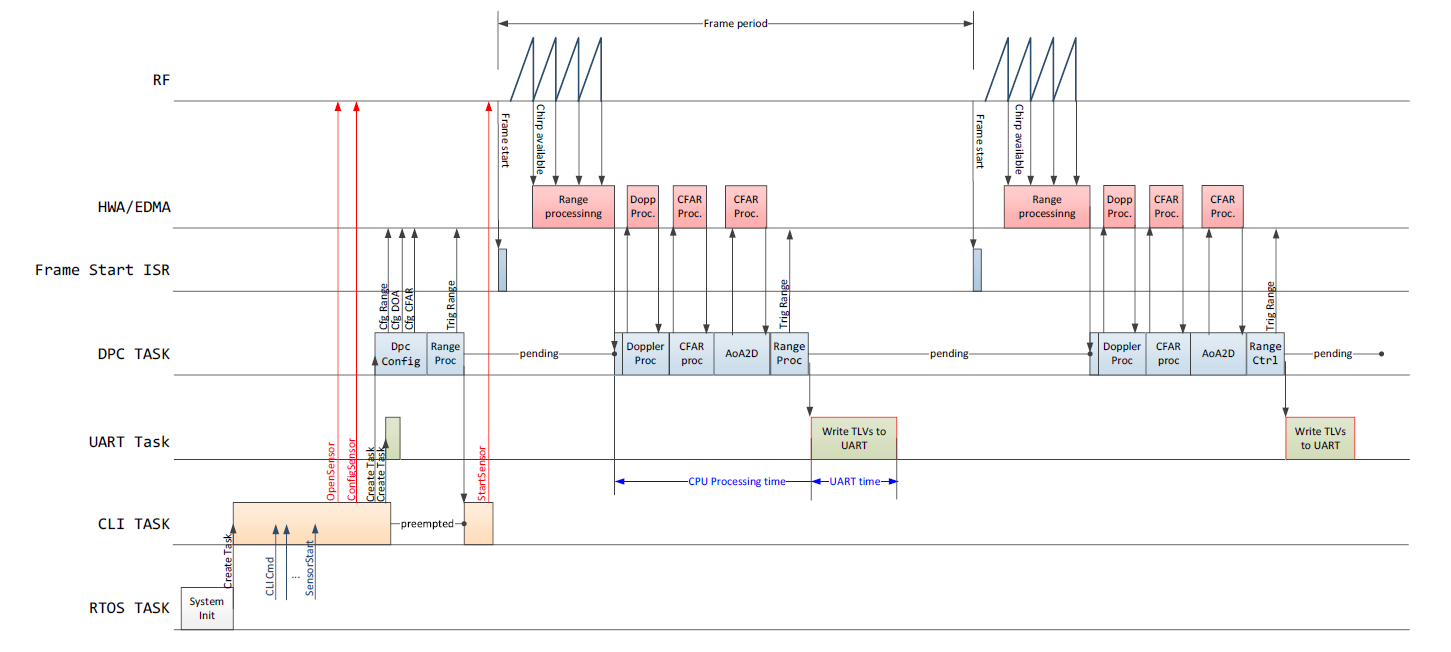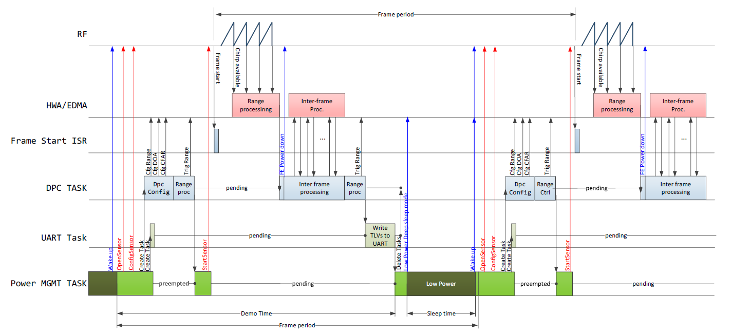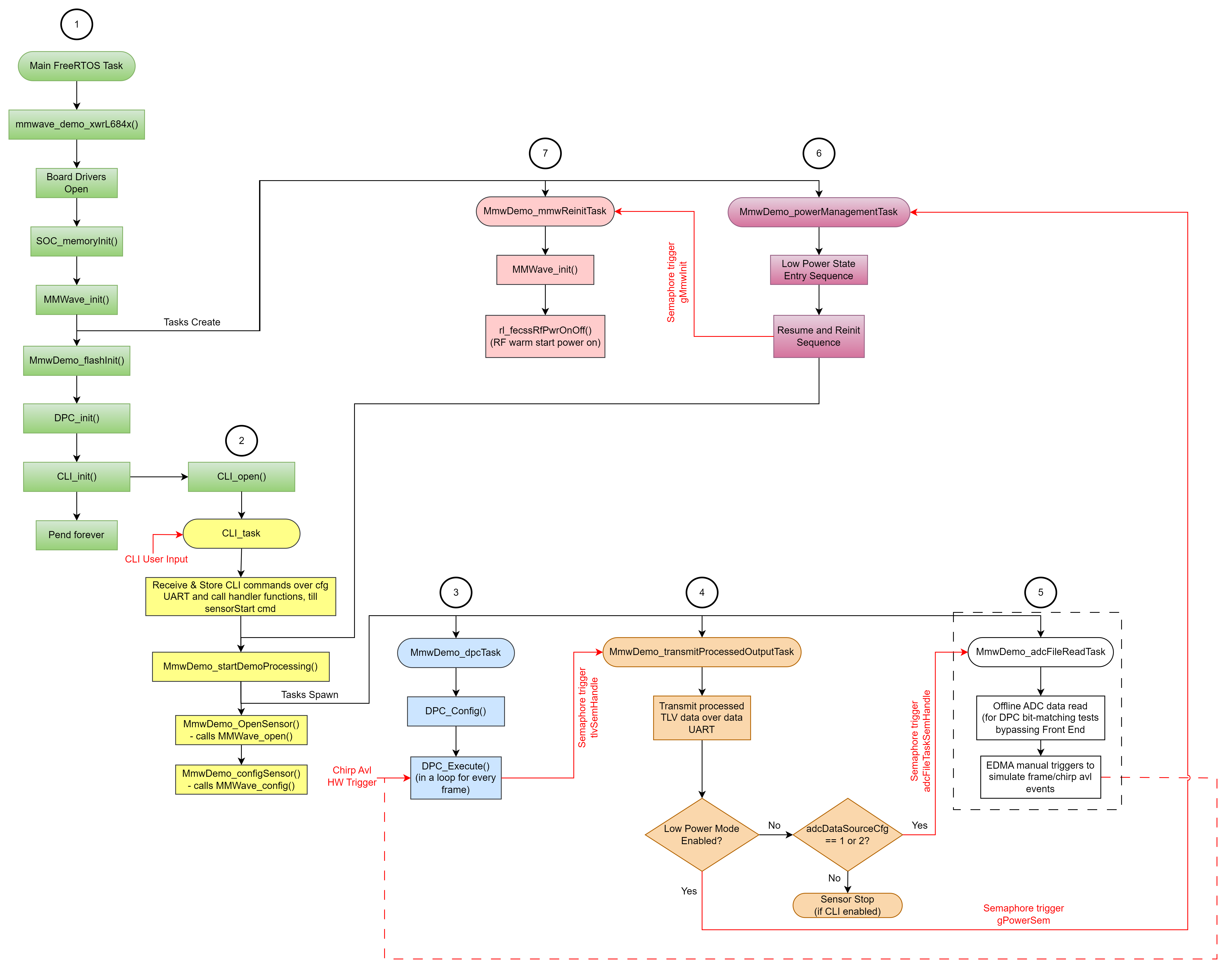 This demo is implemented on xWRL684x using multiple tasks running in the system. Below shows the task flow and tasks used in the system.