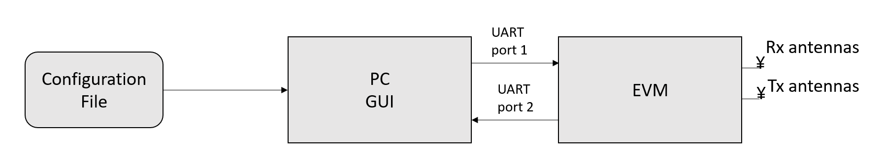 The demo detection demo setup is shown in Figure below. The demo configuration is provided by the command line interface (CLI) configuration file. The PC visualizer is connected to xWRL684x EVM board via a two UART ports. Initially, to start a demo, a set of CLI configuration commands is sent to the EVM. Based on the configuration the EVM sends through the different port various detection information to the visualizer, such as point cloud, range profile, and stats data.