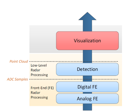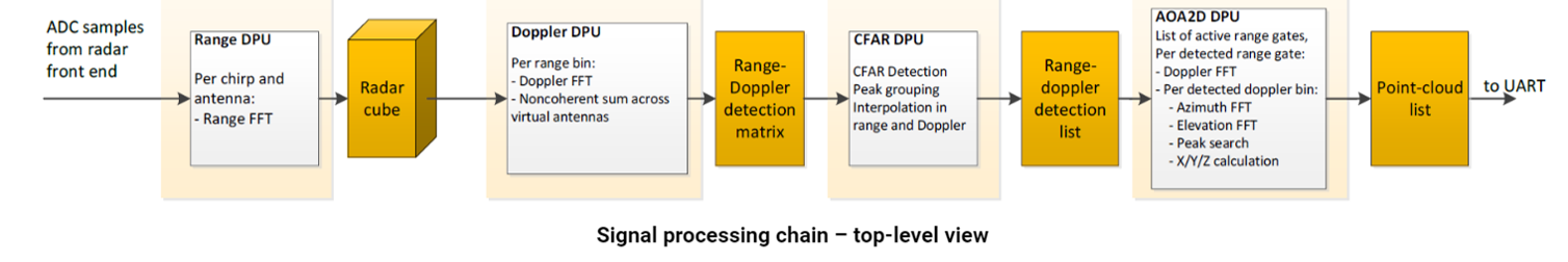 The top-level view of this signal processing chain is shown in Figure below. This chain performs object detection in dange-doppler detection matrix.
