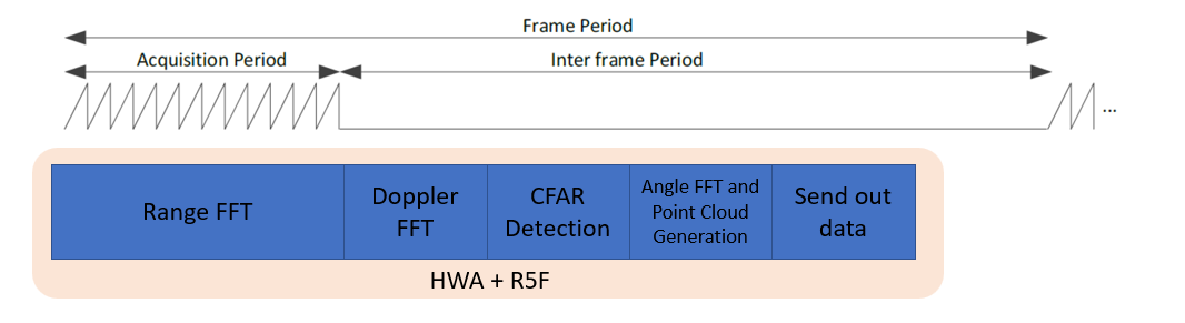 The millimeter wave demo (Mmwave_demo) is the out of box (OOB) millimeter wave radar signal processing chain demo on xWRL684x SOC device. This chapter presents the millimeter wave demo (mmwave_demo) radar signal processing chain demo implementation details on xWRL684x SOC device using the MMWAVE LP SDK. The chapter provides a description of the signal processing flow. It also focuses on the implementation details of the low-level signal processing chain. The processing chain is based on range-doppler detection.