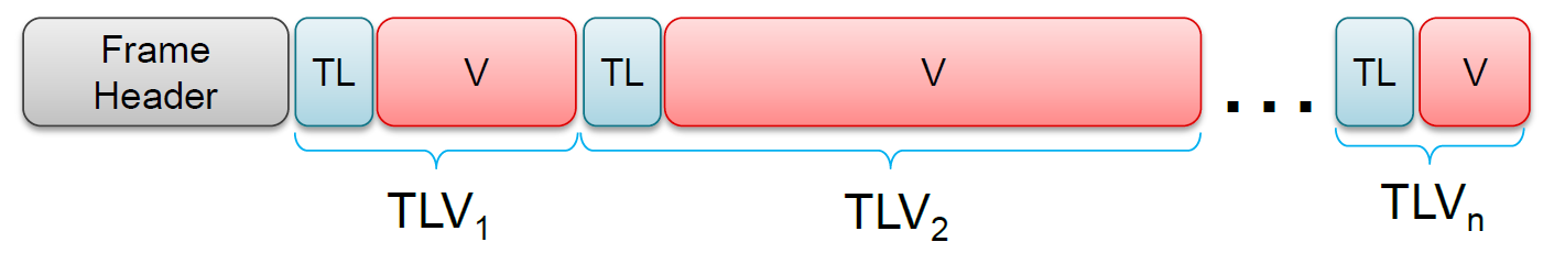 The packet structure consists of fixed sized frame header, followed by variable number of TLVs (see Figure below). Each TLV has fixed header followed by variable size payload. The Byte order is Little Endian.