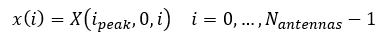 From the radar cube stored as a complex16 3D array 𝑋[𝑟𝑎𝑛𝑔𝑒][𝑐ℎ𝑖𝑟𝑝][𝑎𝑛𝑡𝑒𝑛𝑛𝑎], the received symbols are extracted at the range index 𝑖𝑝𝑒𝑎𝑘 of the peak position corresponding to the target as