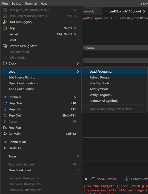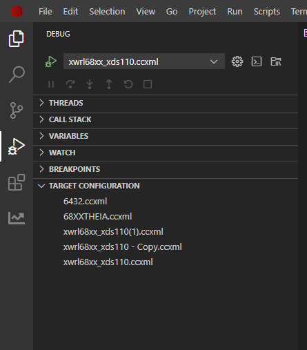 - Right-click your target configuration file (e.g., "xwrl68xx_xds110.ccxml") and select "Start Project-less Debug"