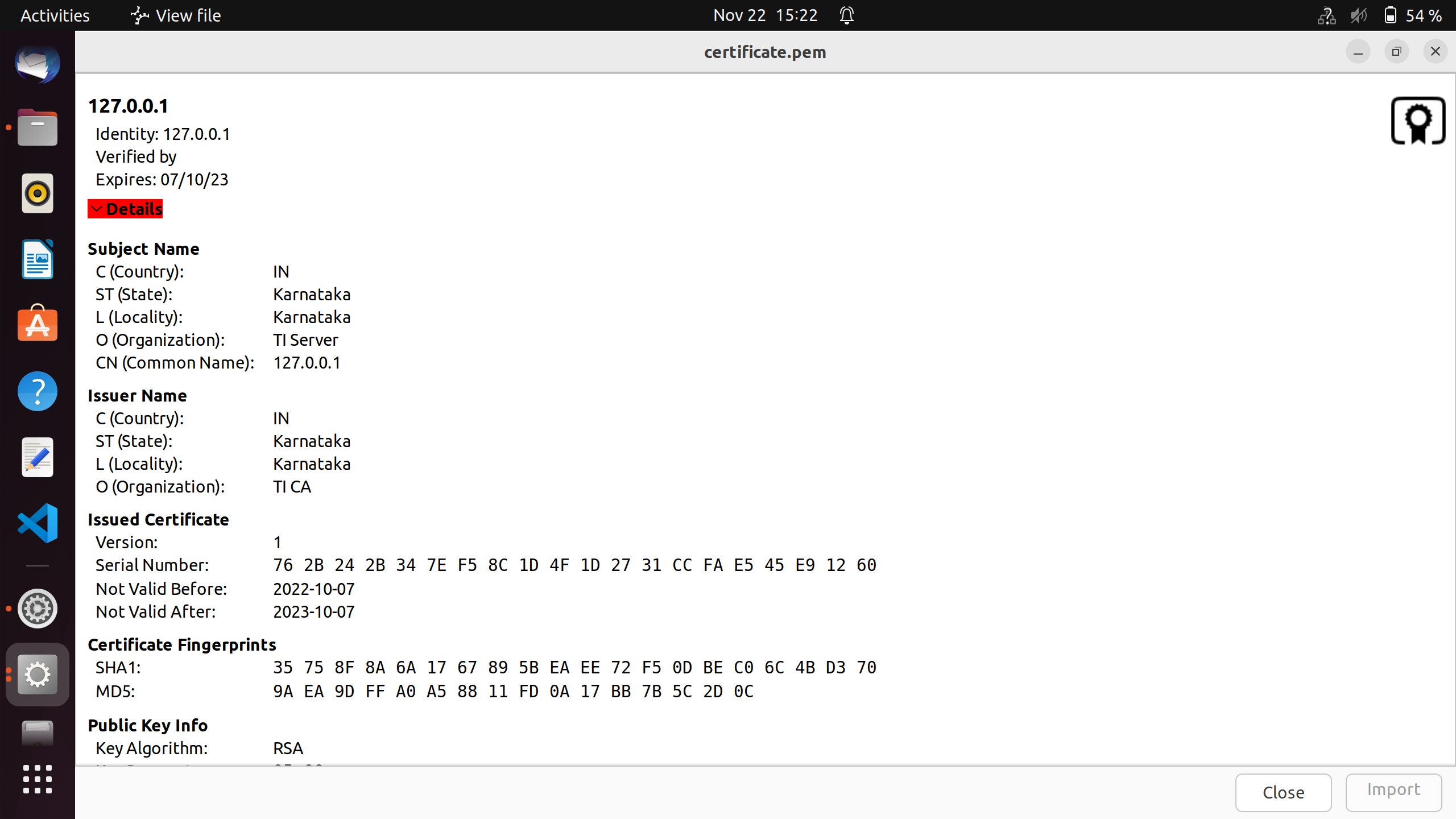 Here we use self signed openSSL generated certificates for TLS handshake. The steps for generation of certificate are shown below. First we generate the certificates and then convert it to DER format, which is further converted to hex and used in "server_certificates.h" file.