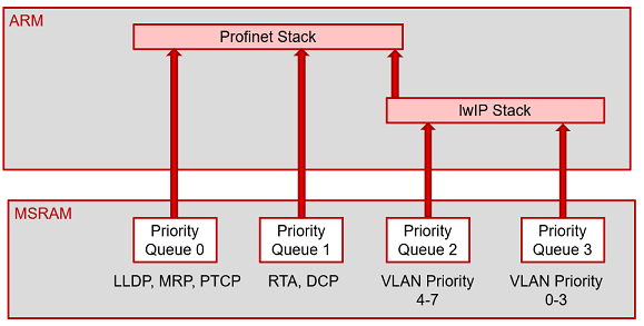 In case of Profinet firmware, the queues are designed as shown in the diagram below. The highest priority queues are used for LLDP, MRP, DCP, RTA and PTCP. These packets are directly forwarded to the registered callback in ICSS-EMAC (using rxRTCallBack). And the Queues 2 and 3 are forwarded to TCP/IP. Profinet FWHAL and stack also uses the TX/RX APIs available in the ICSS-EMAC for transmission/reception of packets like PTCP, LLDP, etc. More info on ICSS-EMAC can be found here.
