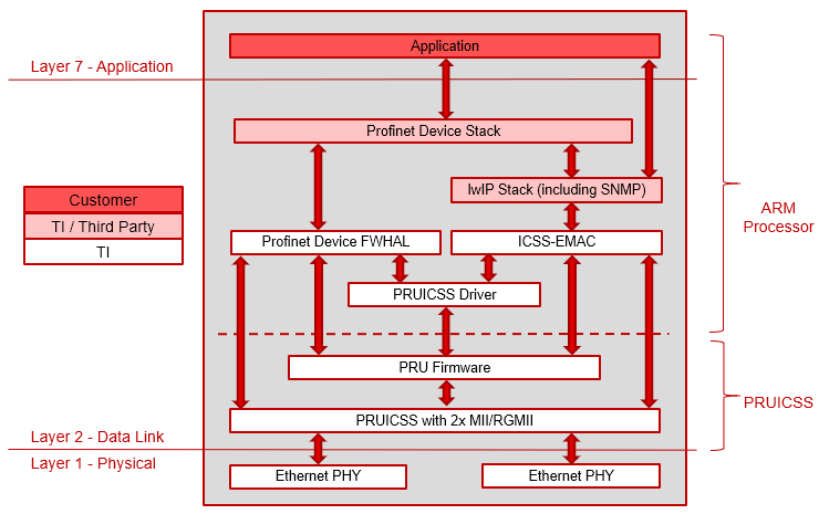 Profinet firmware for PRU-ICSS is a black box product maintained by TI. Profinet Device FWHAL (Firmware and Hardware Abstraction Layer) allows loading and running Profinet firmware and acts as an interface with the firmware. FWHAL implements the key interface between Profinet Device firmware and Profinet Device firm stack. It provides stack interface for CPM/PPM management, Triple Buffer Management, MRP, DCP Filter, Multicast Filter, Phase management and PTCP modules.