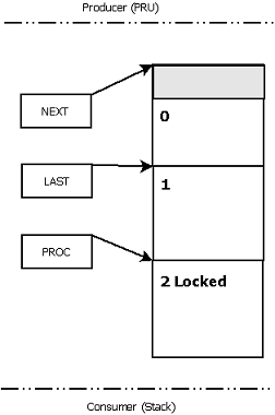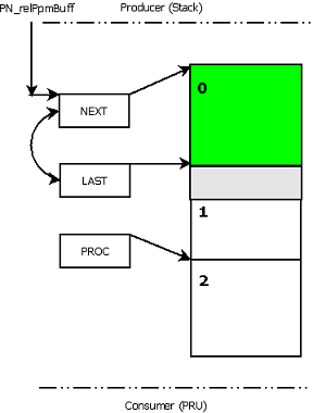 When the PRU has new data to be written, the NEXT and LAST indexes are swapped. This indicates that LAST is pointed to the latest available data (to be consumed by the stack). If the PRU has updated data to be written, it uses the NEXT buffer. The PRU keeps continuing in the loop i.e., switching the NEXT and LAST buffers in a ping pong fashion till the stack consumes the LAST data.