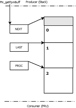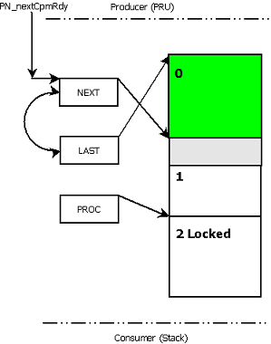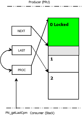 When the stack is ready to consume new data, it calls the API PN_getLastCpm. A swap of LAST and PROC indexes in done here. This indicates the stack consumes the latest data available at any point of time. The stack also should lock the buffer using PN_cpmBuffLock. At this point PRU starts updating any new data in the NEXT buffer.