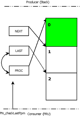 Next, when the PRU is ready to update data (which is send on the wire), PN_checkLastPPM is triggered. At this point, the PROC and LAST indexes are swapped. This enables PRU to send the LAST data, which is the latest available PPM data at any point of time. The validLast flag is cleared, which indicates the PRU that there is no update in the data. Afer this, the stack has NEXT and LAST buffers to update future data (in a ping pong fashion) as shown in Figure 1.