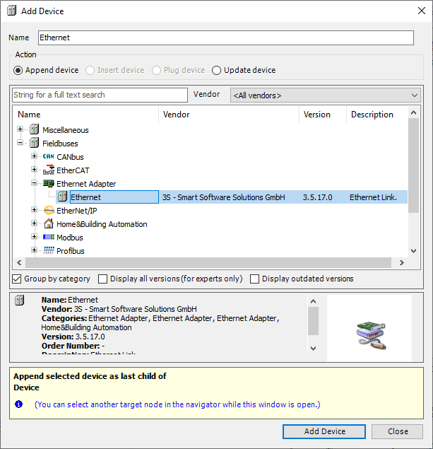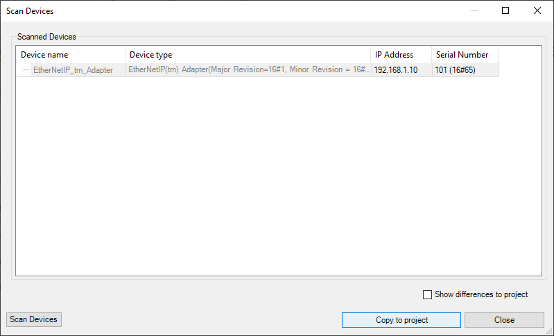 Provided the device description has been installed earlier, the scan process will identify the EtherNet/IP Adapter device which can now be copied to the project.