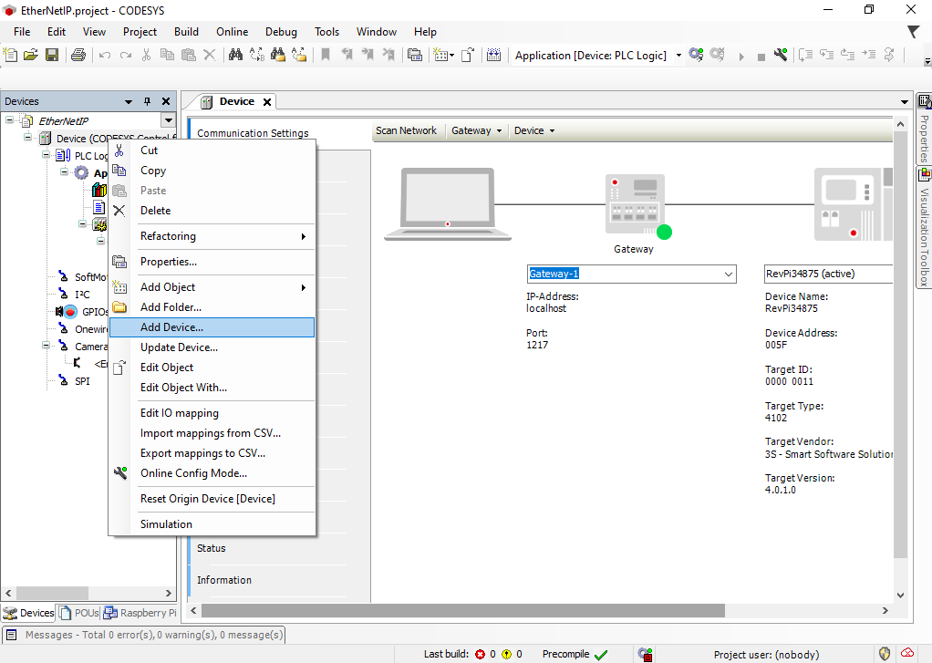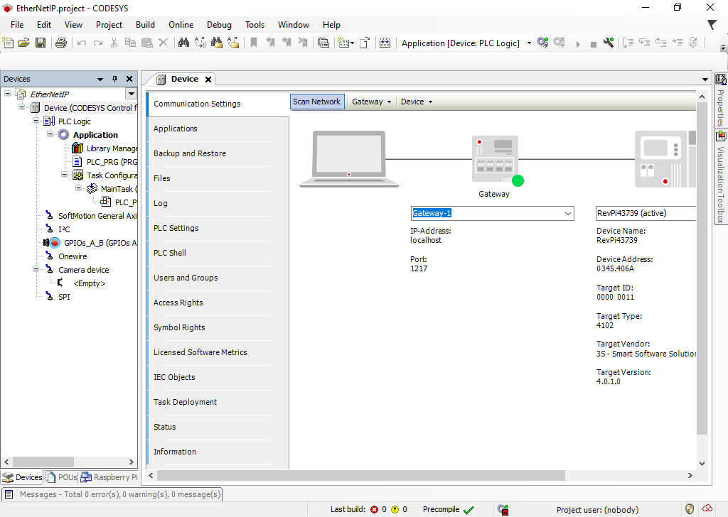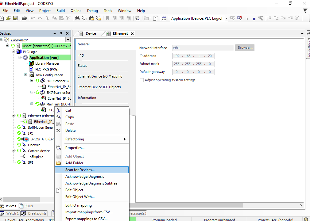 Once complete you can build your project, enter Online mode and start your application. This only starts the EtherNet/IP Scanner from where it is possible to scan for connected Adapter devices.
