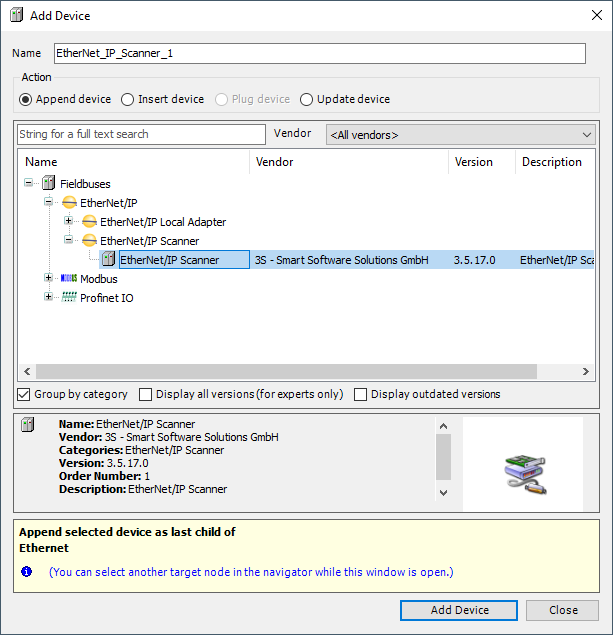 Continue to add an EtherNet/IP Scanner to the Ethernet device.