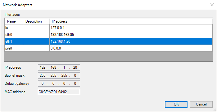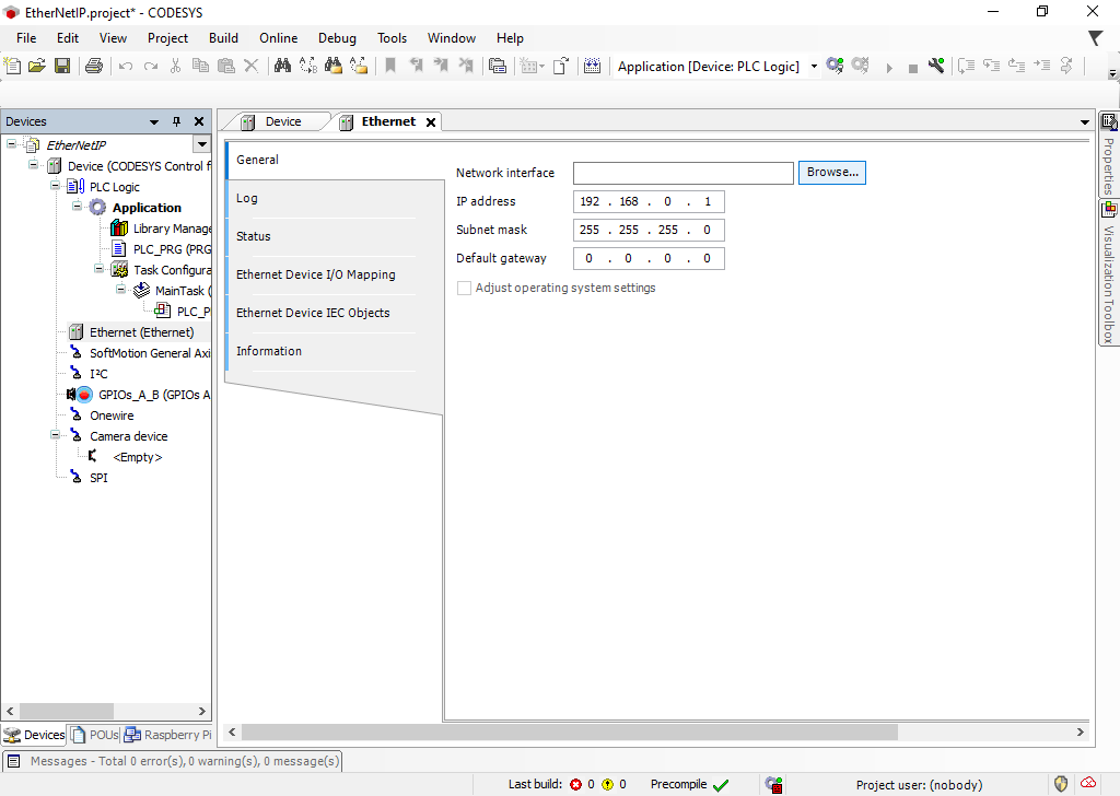 In the device tree double-click on Ethernet to open the Network interface configuration and click on Browse to select the Network interface (in the diagram above port B, eth1) that is connected to your EtherNet/IP Adapter device.