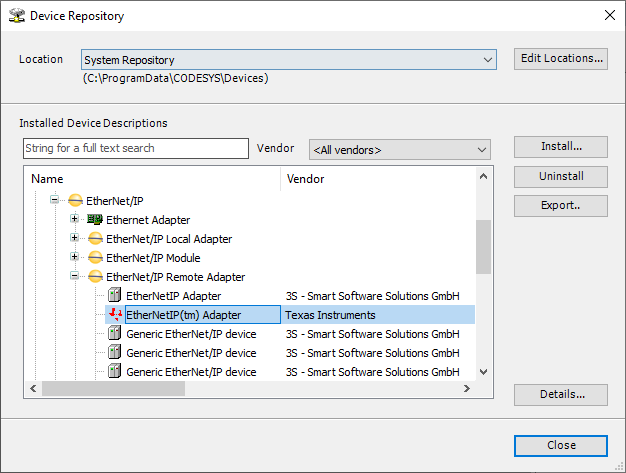 Before configuring the EtherNet/IP network, the matching device description file must be installed into the CODESYS device repository. Navigate to Tools → Device Repository in the menu system and install the files am243x-evm_tiEtherNetIP_freeRTOS.eds or am243x-lp_tiEtherNetIP_freeRTOS.eds which are part of the distribution.