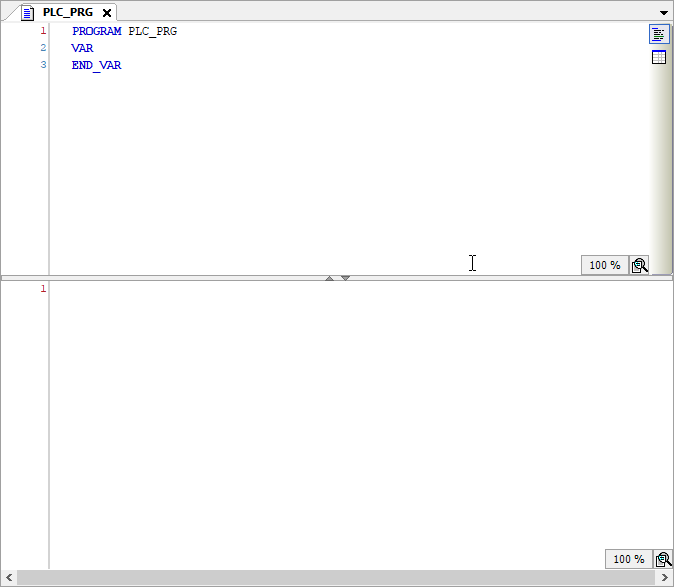 Start with double clicking on PLC_PRG in the project browser. An empty PLC_PRG opens in the central workspace, that by default contains the frame for the variable declaration on top and the programming area below.