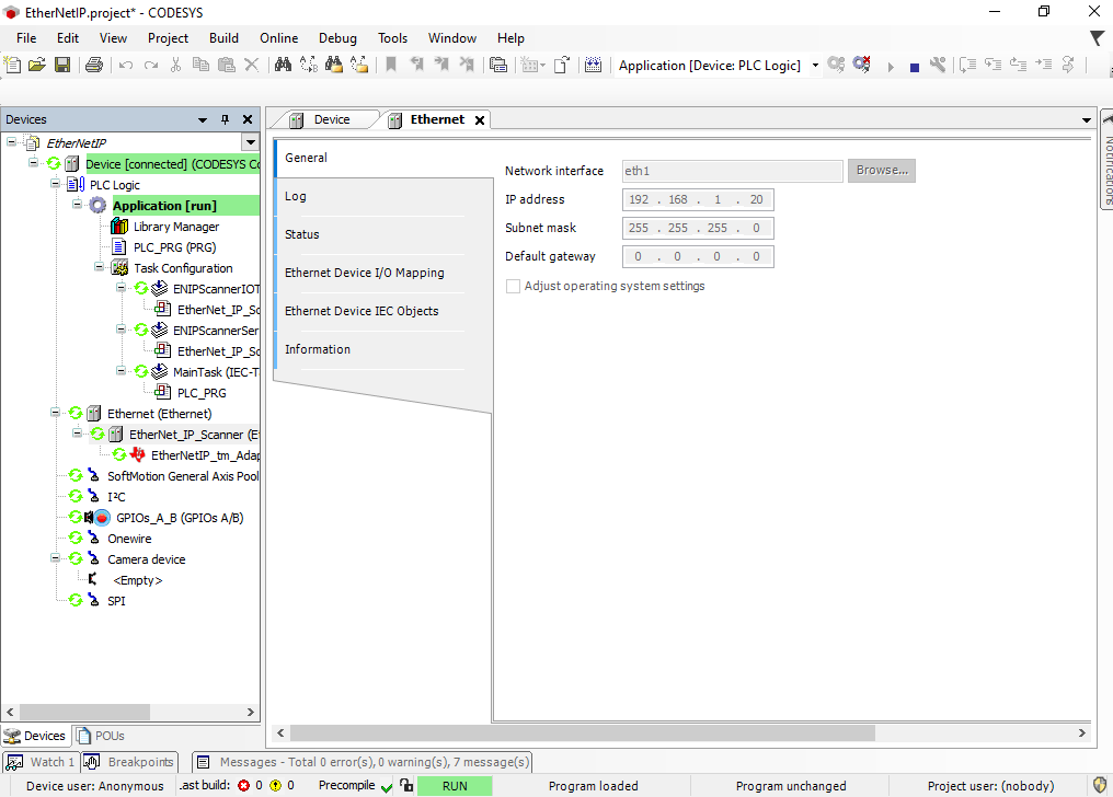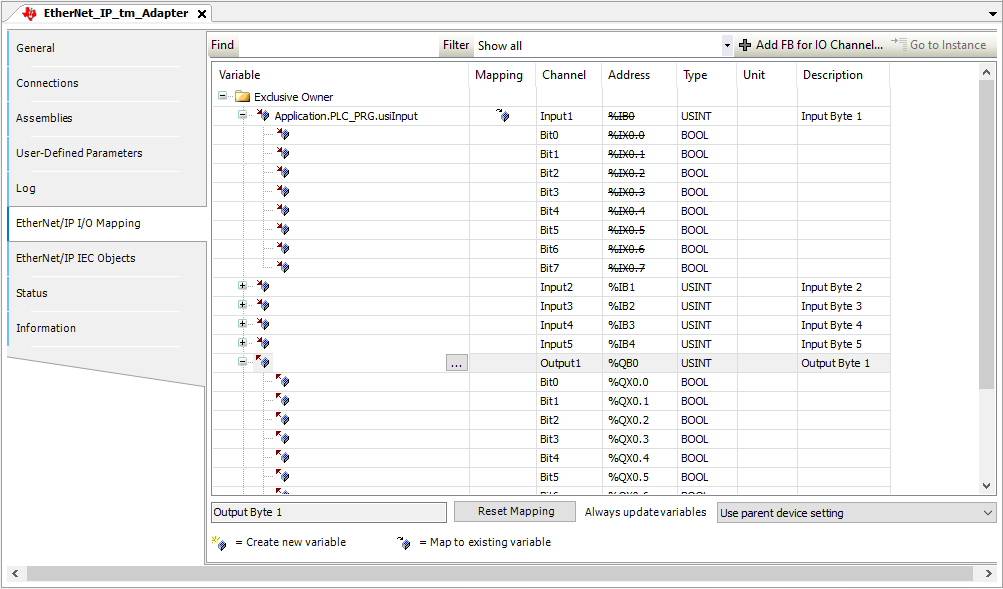 Under EtherNet/IP I/O Mapping the variables of the PLC_PRG are assigned to input or output channels declared for the Adapter device in the corresponding EDS file.