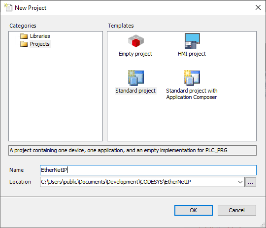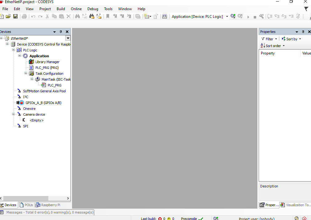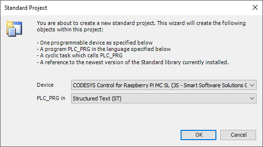 Select CODESYS Control for Raspberry Pi MC SL (3S - Smart Software Solutions GmbH) as device and the programming language of your choice.