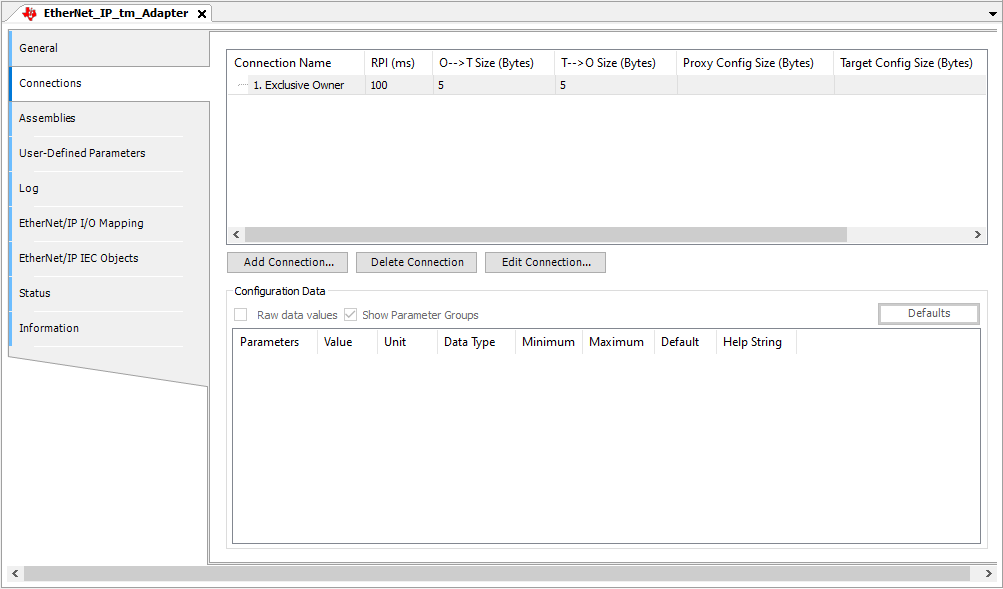 Next, the connections of the EtherNet/IP adapter device need to be configured. Double-click on EtherNet_IP_tm_Adapter in the Device tree. This opens the tab enabling the configuration of the example EtherNet/IP Adapter device. Under Connections, the requested packet interval (RPI) can be set: