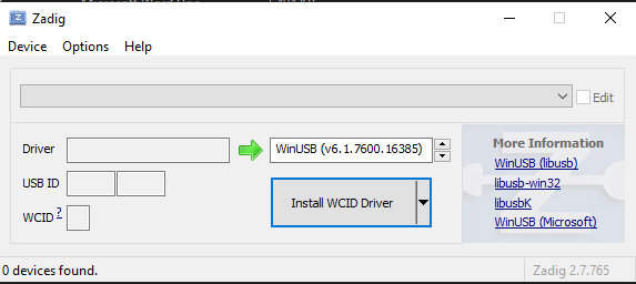 • On windows we have to make sure that correct generic USB drivers are installed. We will use Zadig tool to install dependent USB libraries.