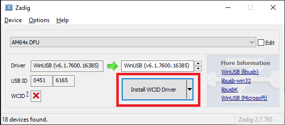 • Select 1.options 2. list all device. Find and select device named AM64x DFU. Click Install WCID Driver.