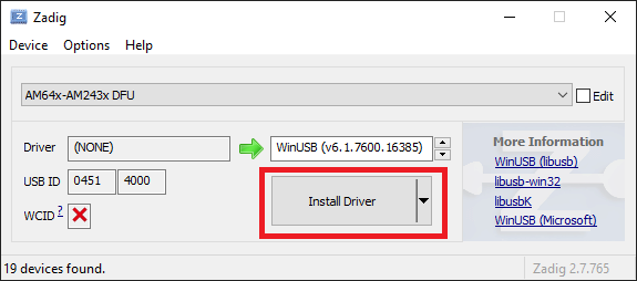 Install drivers for AM64x-AM243x DFU device.