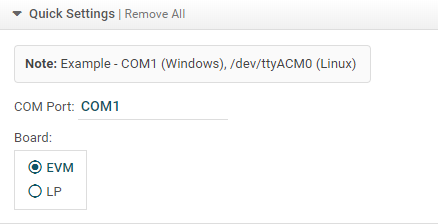 2. Enter the appropriate COM Port and select the board type. Make sure the UART port used for terminal is identified as mentioned in Setup UART Terminal