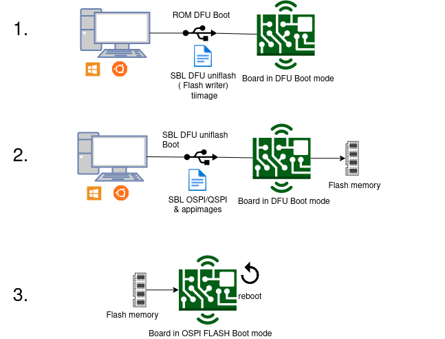 The detailed sequence of steps that happen when flashing files is listed below, refer to the EVM Setup page to see how to setup the EVM in different boot modes that are needed for this sequence of steps.